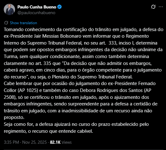 O advogado do presidente Jair Bolsonaro, Paulo Cunha Bueno, disse nesta terça-feira (25) que a decisão do ministro Alexandre de Moraes de declarar a conclusão do processo sobre golpe de Estado foi ‘erro grave’ e que apresentará embargos infringentes.