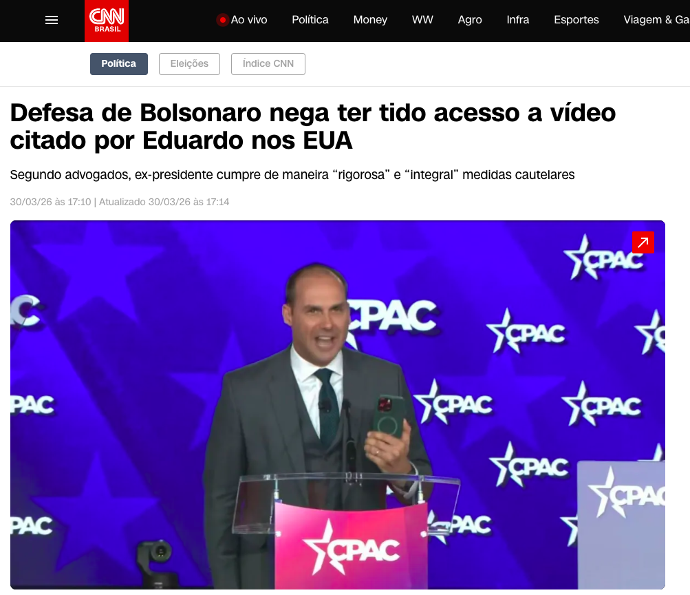 “Não houve recebimento de qualquer vídeo gravado no CPAC por Eduardo Bolsonaro ou outro de qualquer natureza. Em consequência, não houve exibição desse ou de qualquer outro material ao ex-presidente Bolsonaro, uma vez que as prescrições judiciais estão sendo cumpridas integralmente.”