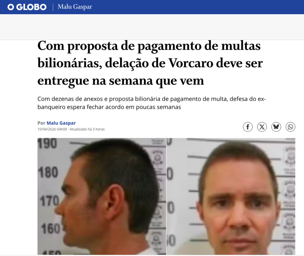Vorcaro está preso desde o início de abril e, desde 19 de março, encontra-se na Superintendência da PF em Brasília. Uma força-tarefa com cerca de dez advogados, dividida entre os escritórios do criminalista José Luís Oliveira Lima e de Sergio Leonardo, trabalha na análise de celulares apreendidos, perícias e documentos para embasar os relatos.