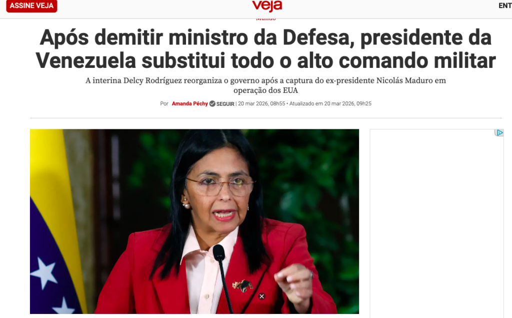 Delcy Rodríguez, anunciou na sexta-feira (20 de março de 2026) a substituição integral do alto comando militar do país, poucos dias após a demissão do ministro da Defesa.