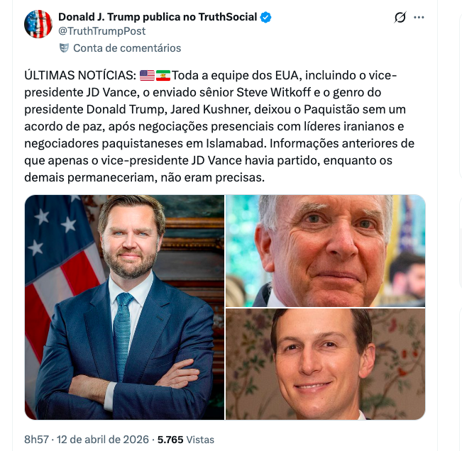 A delegação americana de alto nível, que incluía o vice-presidente JD Vance, o enviado especial Steve Witkoff e o genro do presidente Donald Trump, Jared Kushner, deixou o Paquistão neste domingo sem alcançar um acordo de paz com o Irã.