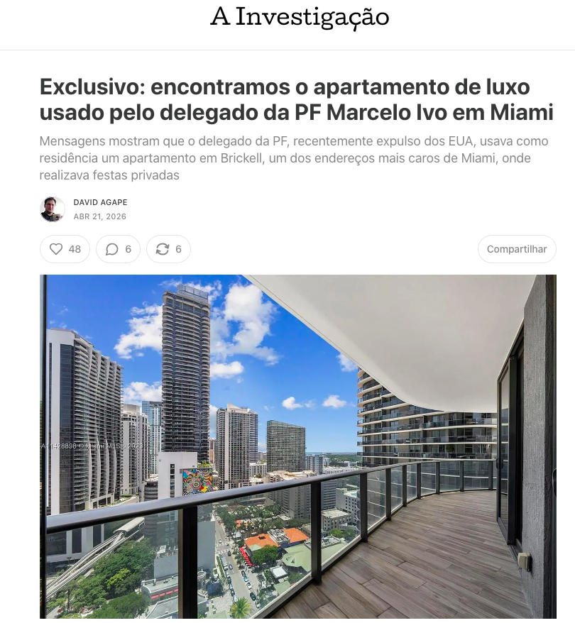 O delegado da Polícia Federal Marcelo Ivo de Carvalho, recentemente expulso dos Estados Unidos, mantinha residência em um apartamento de alto padrão no bairro de Brickell, em Miami. O imóvel, localizado no condomínio SLS Lux Brickell (801 S Miami Ave, unit 2301), era usado para realizar festas privadas, conforme mensagens obtidas em investigação exclusiva.