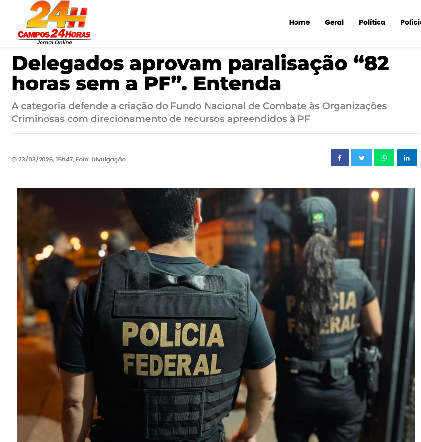 Delegados da Polícia Federal aprovaram, em assembleia, a realização de uma paralisação nacional de 82 horas, batizada de “82 horas sem a PF”. A medida, que deve ocorrer entre quarta-feira (25) e sábado (28) de março, coincide exatamente com o aniversário de 82 anos da corporação.