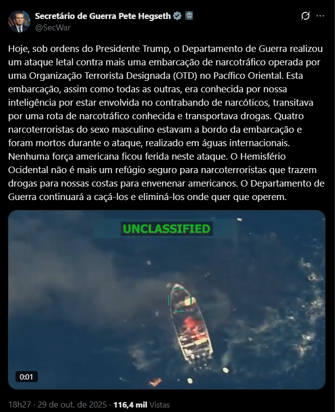 “Hoje, sob ordens do Presidente Trump, o Departamento de Guerra realizou um ataque letal contra mais uma embarcação de narcotráfico operada por uma Organização Terrorista Designada (OTD) no Pacífico Oriental. Esta embarcação, assim como todas as outras, era conhecida por nossa inteligência por estar envolvida no contrabando de narcóticos, transitava por uma rota de narcotráfico conhecida e transportava drogas. Quatro narcoterroristas do sexo masculino estavam a bordo da embarcação e foram mortos durante o ataque, realizado em águas internacionais. Nenhuma força americana ficou ferida neste ataque. O Hemisfério Ocidental não é mais um refúgio seguro para narcoterroristas que trazem drogas para nossas costas para envenenar americanos. O Departamento de Guerra continuará a caçá-los e eliminá-los onde quer que operem.”, escreveu o Secretário da Guerra de Trump