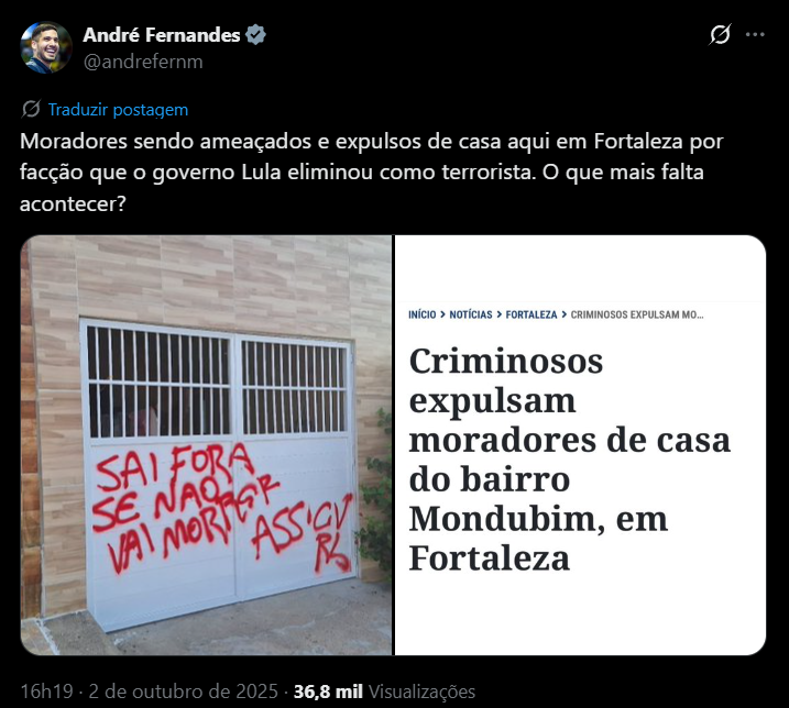 O deputado federal André Fernandes, publicou um vídeo revelando a atuação do Crime Organiazado que transformou em uma cidade fantasma devido a sua atuação no local.