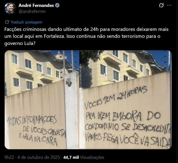 Além disso, Fernandes chama atenção para símbolos de facções criminosas, como o número 13, associado ao PT (Partido dos Trabalhadores), sugerindo uma conexão política com o crime organizado. Ele questiona a eficácia do governo e a omissão frente à criminalidade, destacando que a situação reflete um problema maior de governança e segurança no Brasil.