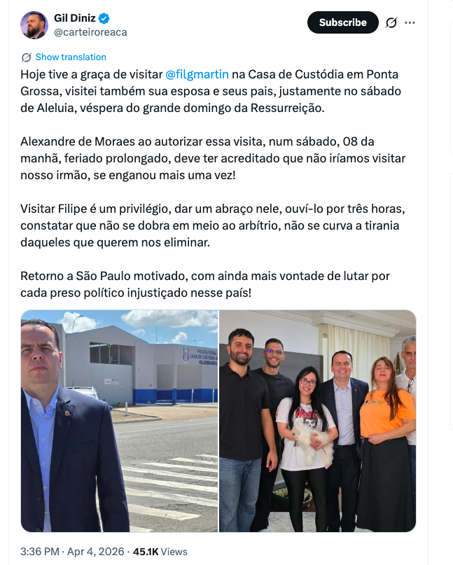 Em publicação nas redes sociais, o parlamentar descreveu a visita como um momento especial, realizado justamente na véspera do Domingo de Páscoa. “Hoje tive a graça de visitar Filipe Martins na Casa de Custódia em Ponta Grossa, visitei também sua esposa e seus pais, justamente no sábado de Aleluia, véspera do grande domingo da Ressurreição”, escreveu Gil Diniz.