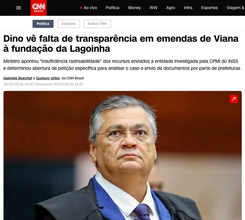 O ministro do Supremo Tribunal Federal (STF), Flávio Dino, apontou insuficiência de transparência e de rastreabilidade nos esclarecimentos apresentados sobre emendas parlamentares de R$ 3,6 milhões destinadas à Fundação Oasis, entidade ligada à Igreja Batista da Lagoinha, de acordo com a matéria da CNN BRASIL.