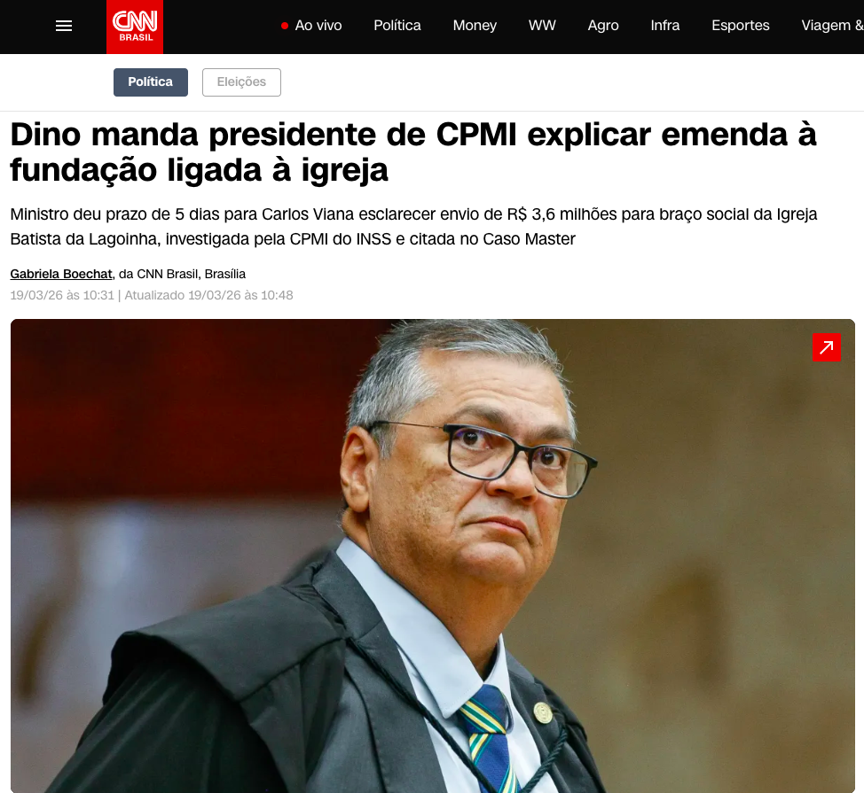 O ministro Flávio Dino (STF) determinou que o senador Carlos Viana (Podemos-MG), presidente da CPMI do INSS, apresente explicações detalhadas sobre emenda parlamentar que destinou recursos a uma fundação ligada a igreja, de acordo com a matéria da CNN BRASIL.