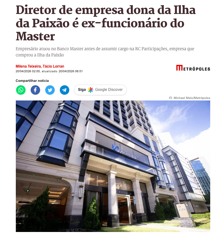 O diretor da RC Participações, Assessoria e Consultoria Empresarial S.A. — empresa que adquiriu a Ilha da Paixão em 2023 — é ex-funcionário do Banco Master. Márcio Vieira Lemos ocupou cargo de chefia no departamento jurídico da instituição e também era responsável por uma área de gestão de imóveis do banco comandado por Daniel Vorcaro, de acordo com a matéria do Metrópoles.