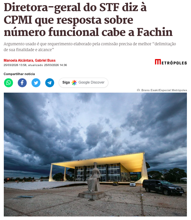 A diretora-geral do Supremo Tribunal Federal (STF), Desdêmona Tenório de Brito Toledo Arruda, respondeu à Comissão Parlamentar Mista de Inquérito (CPMI) que investiga fraudes no Instituto Nacional do Seguro Social (INSS) que a resposta sobre o número funcional da Corte utilizado em conversas com o banqueiro Daniel Vorcaro, dono do Banco Master, cabe ao presidente do tribunal, ministro Edson Fachin, de acordo com a matéria do Metrópoles.