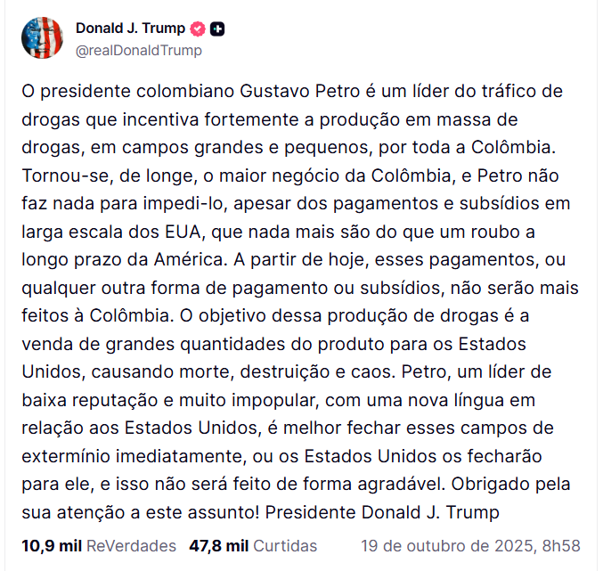 “O presidente Gustavo Petro, da Colômbia, é um líder do tráfico de drogas ilegais que incentiva fortemente a produção em massa de drogas, em campos grandes e pequenos, por toda a Colômbia. Tornou-se, de longe, o maior negócio da Colômbia, e Petro não faz nada para impedi-lo, apesar dos pagamentos e subsídios em larga escala dos EUA, que nada mais são do que um roubo a longo prazo da América. A partir de hoje, esses pagamentos, ou qualquer outra forma de pagamento ou subsídios, não serão mais feitos à Colômbia. O objetivo dessa produção de drogas é a venda de grandes quantidades do produto para os Estados Unidos, causando morte, destruição e caos. Petro, um líder de baixa reputação e muito impopular, com uma nova língua em relação aos Estados Unidos, é melhor fechar esses campos de extermínio imediatamente, ou os Estados Unidos os fecharão para ele, e isso não será feito de forma agradável. Obrigado pela sua atenção a este assunto” escreveu o republican conforme postagem abaixo