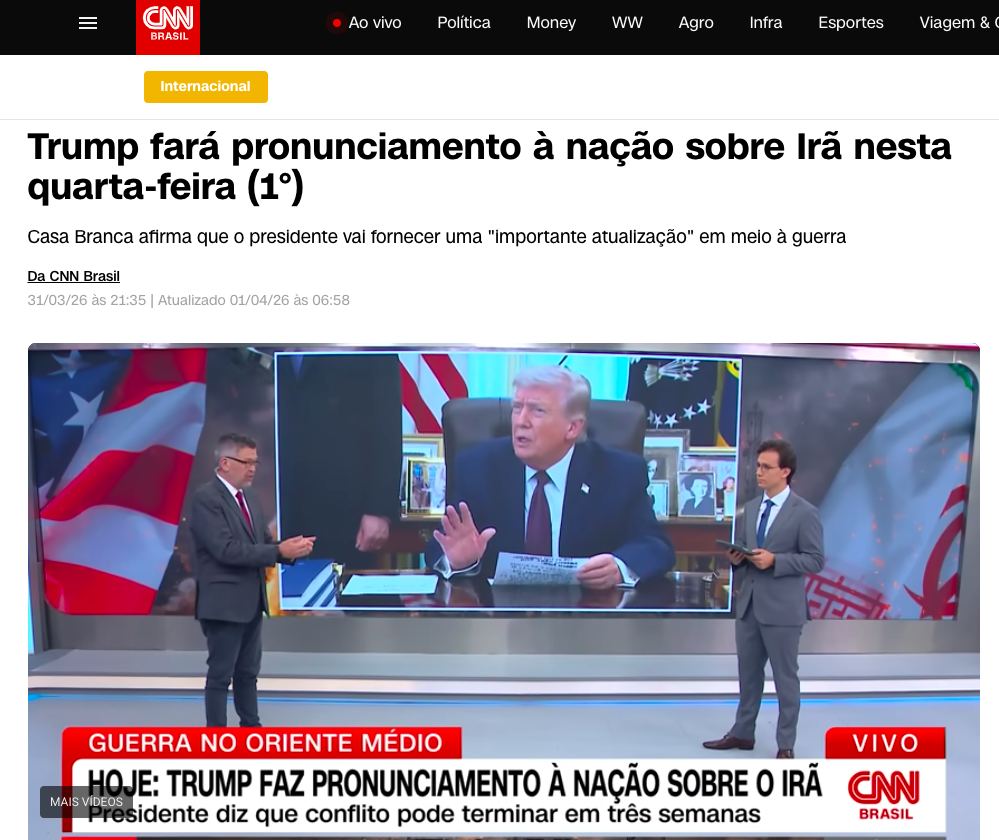 O presidente dos Estados Unidos, Donald Trump, deve se dirigir ao povo americano nesta quarta-feira (1º) com um pronunciamento televisionado sobre o Irã. O discurso ocorre em pleno contexto da guerra em andamento no Oriente Médio.