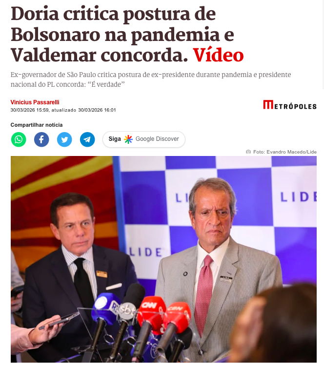 O ex-governador de São Paulo, João Doria, criticou duramente a conduta do presidente Jair Bolsonaro (PL) durante a pandemia de Covid-19. Segundo Doria, Bolsonaro cometeu um erro ao não apoiar a vacinação e ao adotar uma conduta inadequada na saúde pública, o que teria custado sua reeleição em 2022, de acordo com a matéria do Metrópoles.