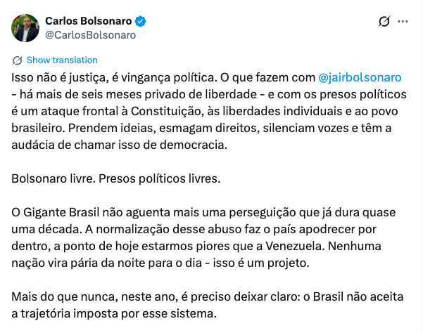 Carlos Bolsonaro declara: “Isso não é justiça, é vingança política. O que fazem Bolsonaro há mais de seis meses privado de liberdade – e com os presos políticos é um ataque frontal à Constituição, às liberdades individuais e ao povo brasileiro. Prendem ideias, esmagam direitos, silenciam vozes e têm a audácia de chamar isso de democracia.”