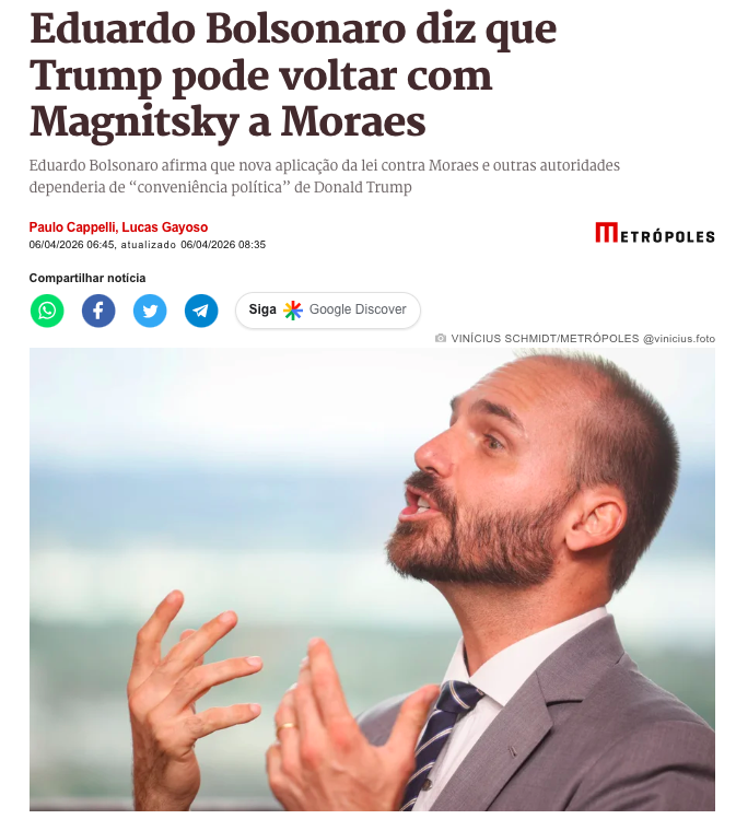 Segundo Eduardo, a decisão de reativar as sanções dependeria apenas de uma avaliação política: “Basta uma conveniência política para o Trump, o secretário Rubio e o secretário Bessent apertarem novamente o botão e voltar a vigorar a Magnitsky contra essas pessoas”.