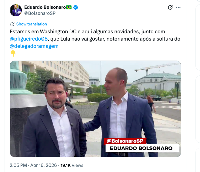 “Estamos em Washington DC e aqui algumas novidades, junto com Paulo Figueiredo, que Lula não vai gostar, notoriamente após a soltura do Alexandre Ramagem.”