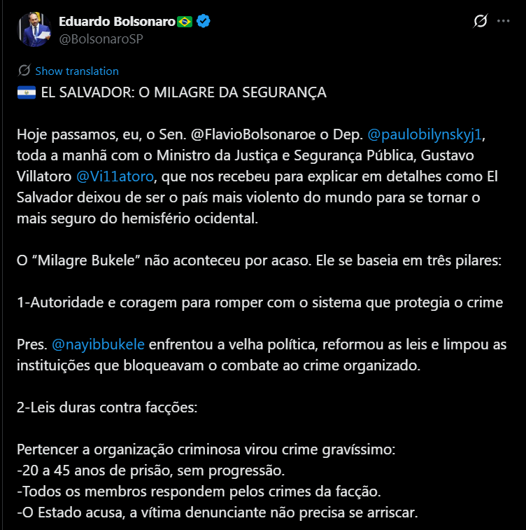 Nas redes sociais, nesta terça 18/11 o deputadoe Eduardo Bolsonaro relatou seu empenho em loco em El Salvador para tratar de segurança pública