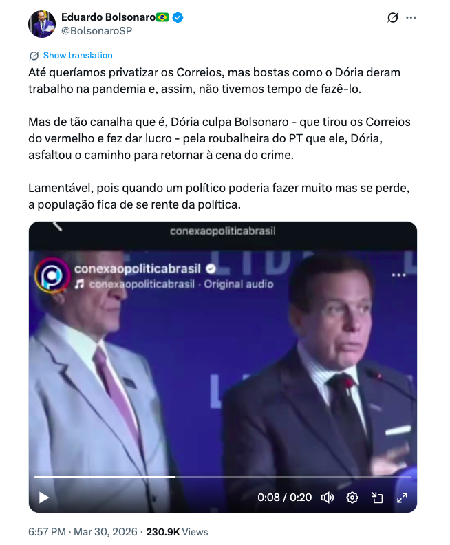 Em publicação nas redes sociais na segunda-feira (30 de março de 2026), Eduardo Bolsonaro reagiu às declarações feitas por Doria durante evento do Lide, ao lado do presidente nacional do PL, Valdemar Costa Neto.