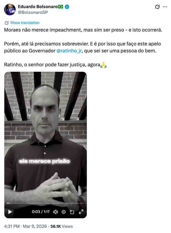 Eduardo publica mensagem dura nas redes afirmando que Alexandre de Moraes “não merece impeachment, mas sim ser preso” e pede intervenção urgente do governador do Paraná para “fazer justiça, agora”