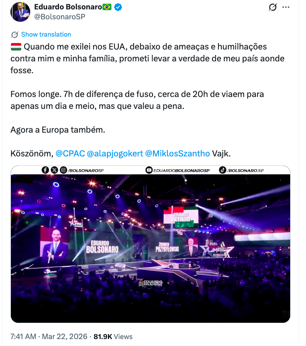 Após o evento na Hungria, Eduardo segue para o CPAC USA 2026, em Grapevine, Texas (25 a 28 de março), onde também foi confirmado como palestrante.