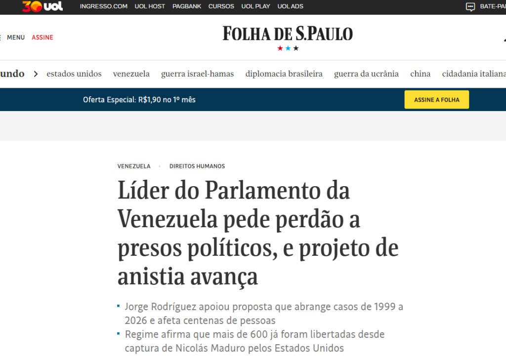 A medida é vista como parte das negociações internas para transição política após a captura de Maduro por forças internacionais e a instalação de um governo interino liderado por Delcy Rodríguez.