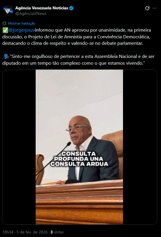 A declaração foi feita durante sessão plenária em Caracas, nesta quinta-feira (5 de fevereiro de 2026), e ocorre em paralelo ao avanço acelerado do projeto de lei de anistia ampla, que já tramita em regime de urgência e deve ser votado nas próximas semanas.
