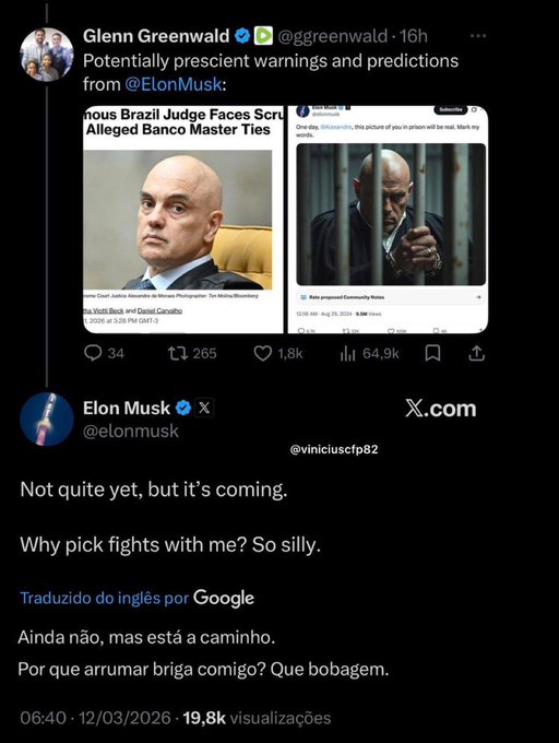 Na postagem, Musk reafirmou sua previsão de que a prisão do ministro Alexandre de Moraes estaria “a caminho” e ainda questionou o motivo do conflito. “Por que arrumar briga comigo? Que bobagem”, afirmou Musk ao comentar novamente a situação envolvendo o magistrado brasileiro.