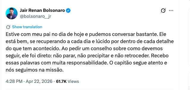 “Ao pedir um conselho sobre como devemos seguir, ele foi direto: não parar, não precipitar e não retroceder”, escreveu Renan, complementando que “recebo essas palavras com muita responsabilidade. O capitão segue atento e nós seguimos na missão”.