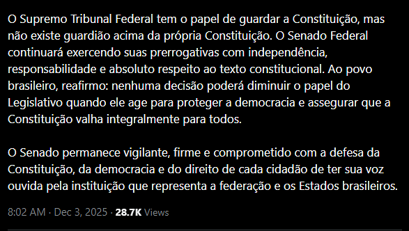“O Supremo Tribunal Federal tem o papel de guardar a Constituição, mas não existe guardião acima da própria Constituição. O Senado Federal continuará exercendo suas prerrogativas com independência, responsabilidade e absoluto respeito ao texto constitucional. Ao povo brasileiro, reafirmo: nenhuma decisão poderá diminuir o papel do Legislativo quando ele age para proteger a democracia e assegurar que a Constituição valha integralmente para todos”, disse.