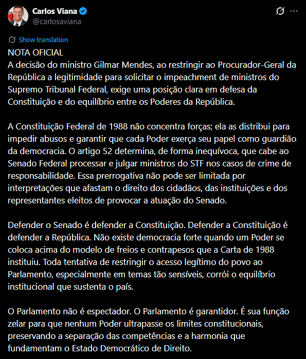 Já o senador Carlos Viana (Podemos-MG) disse que a decisão de Gilmar, “ao restringir ao Procurador-Geral da República a legitimidade para solicitar o impeachment de ministros do Supremo Tribunal Federal, exige uma posição clara em defesa da Constituição e do equilíbrio entre os Poderes da República”.