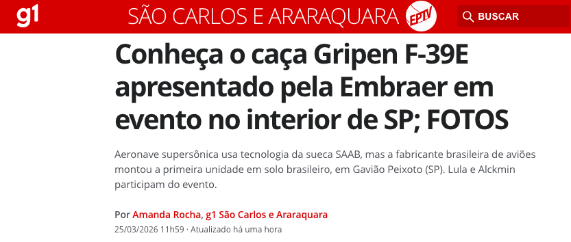Nesta quarta-feira, 25 de março de 2026, a Embraer apresentou ao país o primeiro caça supersônico F-39E Gripen produzido em solo brasileiro. O evento ocorreu no aeródromo da empresa, no interior paulista.