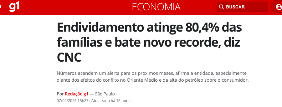 O endividamento das famílias brasileiras atingiu um novo recorde histórico em março de 2026. Segundo a Pesquisa de Endividamento e Inadimplência do Consumidor (Peic), da Confederação Nacional do Comércio de Bens, Serviços e Turismo (CNC), 80,4% das famílias estão endividadas, de acordo com a matéria do G1.