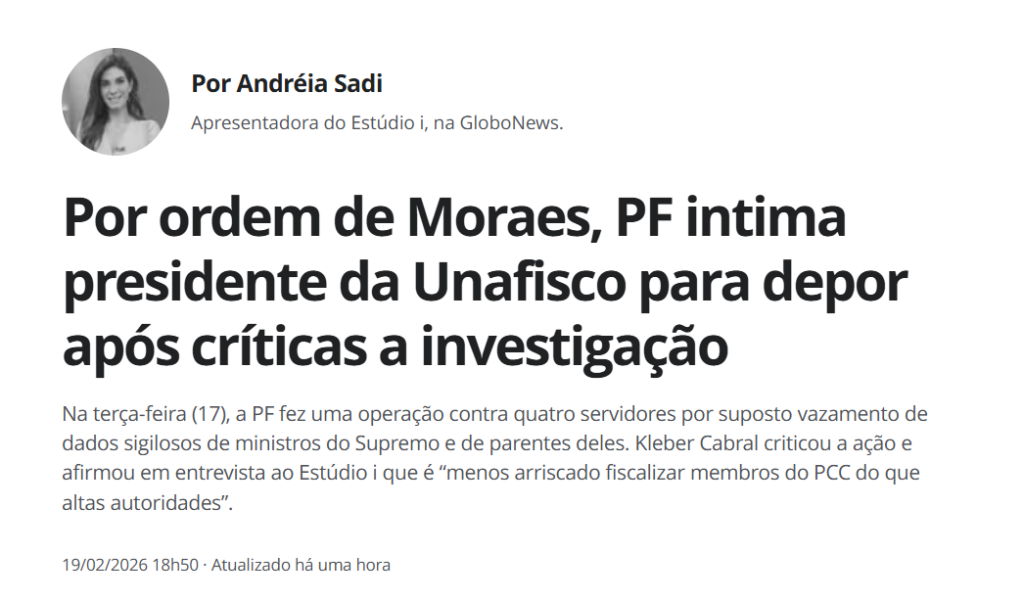 O presidente da Unafisco Nacional, associação que representa os auditores fiscais da Receita Federal, lançou duríssima crítica ao contexto de investigações envolvendo servidores da autarquia e o Supremo Tribunal Federal (STF). Em entrevista ao programa Estúdio i, da GloboNews, nesta quarta-feira (18 de fevereiro de 2026), Kléber Cabral afirmou que ações judiciais recentes criaram um ambiente de intimidação que compromete a atuação profissional dos auditores.