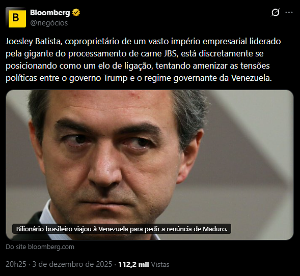 Joesley Batista, um dos principais acionistas da JBS, esteve em Caracas, na Venezuela, com o objetivo de negociar a rendição do ditador Nicolás Maduro.