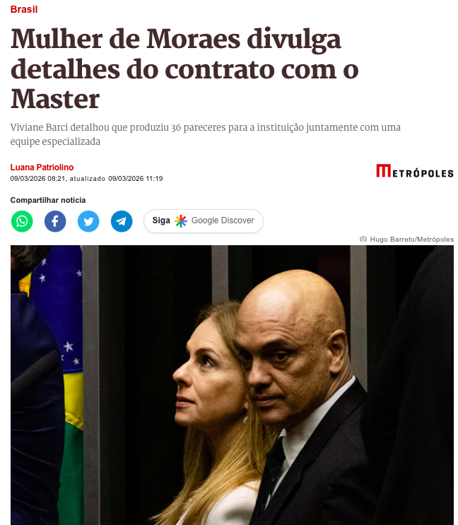 A revelação ganha relevância após a prisão preventiva de Daniel Vorcaro, ex-controlador do Banco Master (liquidado extrajudicialmente em novembro de 2025), e a apreensão de sua agenda telefônica, que continha contatos de Moraes e de sua esposa. A PF já descartou indícios de crime nas mensagens analisadas entre o ministro e o banqueiro, mas o volume de serviços jurídicos contratados pelo banco alimenta questionamentos sobre possíveis conflitos de interesse.