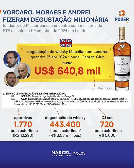 O ponto alto do “escândalo”, segundo a publicação, foi o consumo de uísque Macallan ao custo de US$ 600 mil, inteiramente pago por Vorcaro.
