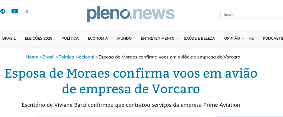 A advogada Viviane Barci de Moraes, esposa do ministro do Supremo Tribunal Federal (STF), Alexandre de Moraes, confirmou que seu escritório de advocacia utilizou aeronaves da Prime Aviation, empresa ligada ao banqueiro Daniel Vorcaro, ex-controlador do Banco Master, de acordo com a matéria do PLENO.NEWS.