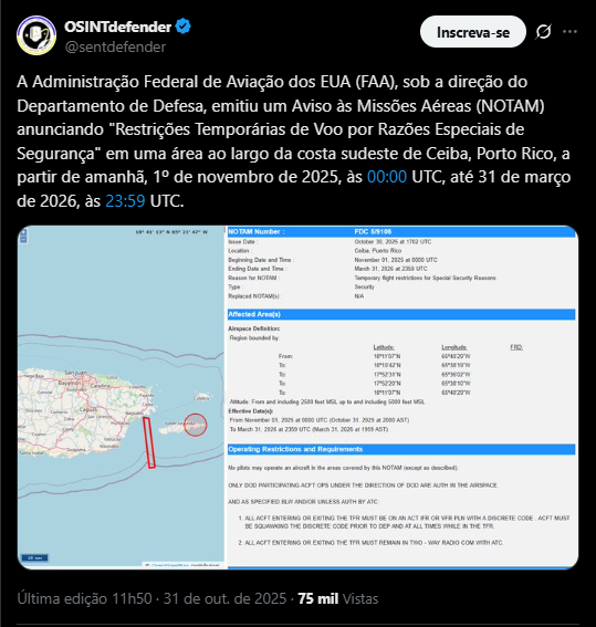 A Administração Federal de Aviação dos EUA (FAA), sob a direção do Departamento de Defesa, emitiu um Aviso às Missões Aéreas (NOTAM) anunciando “Restrições Temporárias de Voo por Razões Especiais de Segurança” em uma área ao largo da costa sudeste de Ceiba, Porto Rico, a partir de amanhã, 1º de novembro de 2025, até 31 de março de 2026.