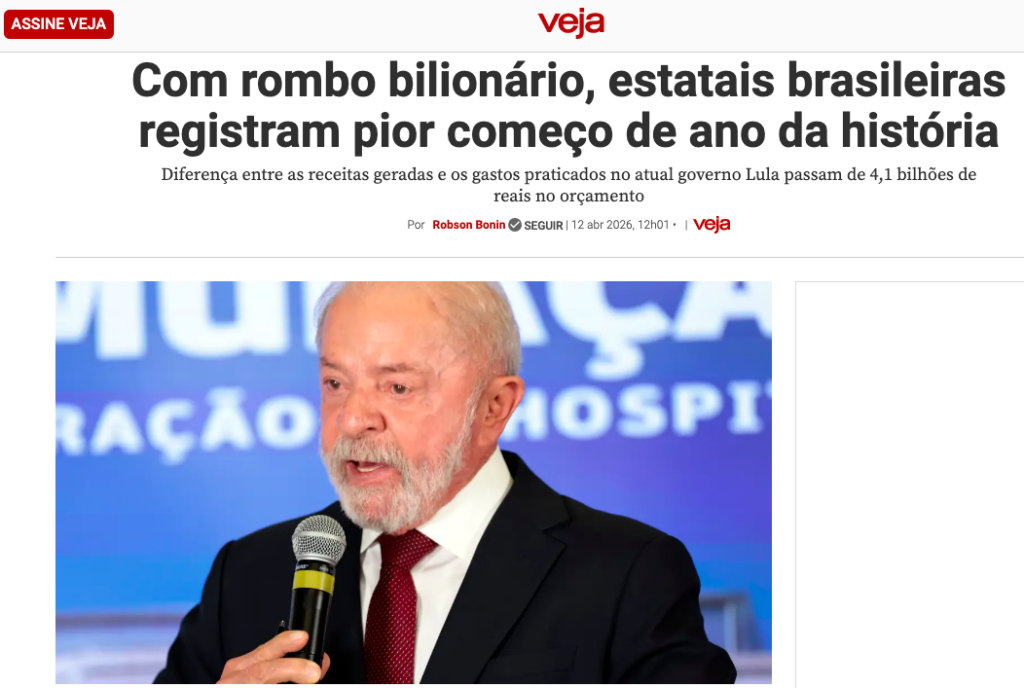 As empresas estatais federais brasileiras tiveram o pior começo de ano da série histórica, com um rombo superior a R$ 4,1 bilhões apenas nos dois primeiros meses de 2026. O resultado negativo — diferença entre receitas e gastos — acende um alerta sobre o desempenho das companhias controladas pelo governo federal, de acordo com a matéria da Revista Veja.