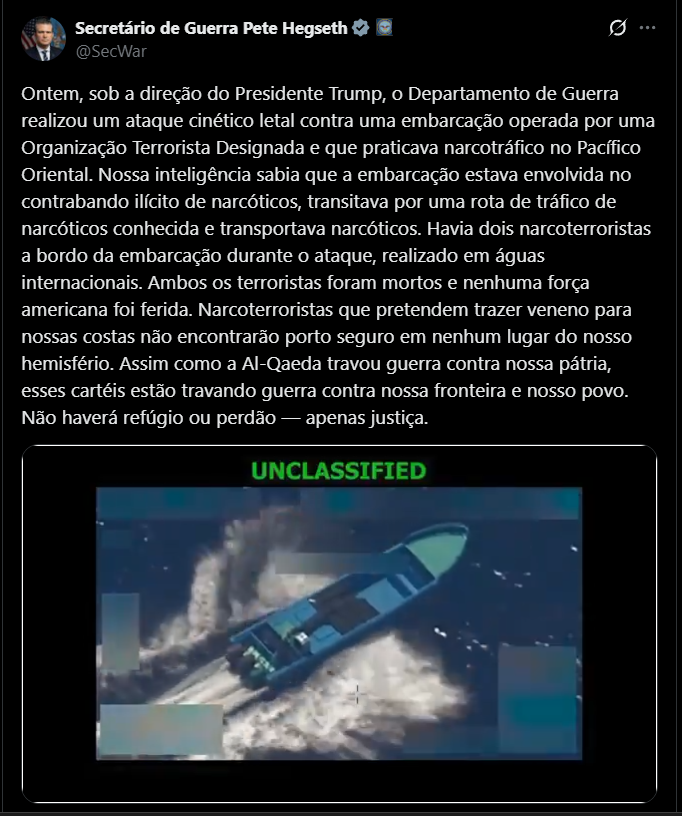 “Ontem, sob a direção do Presidente Trump, o Departamento de Guerra realizou um ataque cinético letal contra uma embarcação operada por uma Organização Terrorista Designada e que praticava narcotráfico no Pacífico Oriental. Nossa inteligência sabia que a embarcação estava envolvida no contrabando ilícito de narcóticos, transitava por uma rota de tráfico de narcóticos conhecida e transportava narcóticos. Havia dois narcoterroristas a bordo da embarcação durante o ataque, realizado em águas internacionais. Ambos os terroristas foram mortos e nenhuma força americana foi ferida. Narcoterroristas que pretendem trazer veneno para nossas costas não encontrarão porto seguro em nenhum lugar do nosso hemisfério. Assim como a Al-Qaeda travou guerra contra nossa pátria, esses cartéis estão travando guerra contra nossa fronteira e nosso povo. Não haverá refúgio ou perdão — apenas justiça”