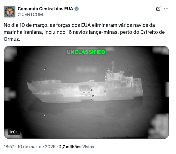 As forças armadas dos Estados Unidos anunciaram ter eliminado múltiplos navios da marinha iraniana, incluindo 16 embarcações lança-minas, nas proximidades do Estreito de Ormuz, em operação realizada no dia 10 de março. O anúncio foi feito pelo Comando Central dos EUA (CENTCOM), que divulgou vídeo mostrando os ataques aéreos ou navais contra as embarcações.