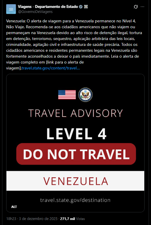 O comunicado, republicado após uma revisão de segurança neste mês, mantém o alerta que está em vigor e reforça: ‘Não viaje para a Venezuela nem permaneça no país’.