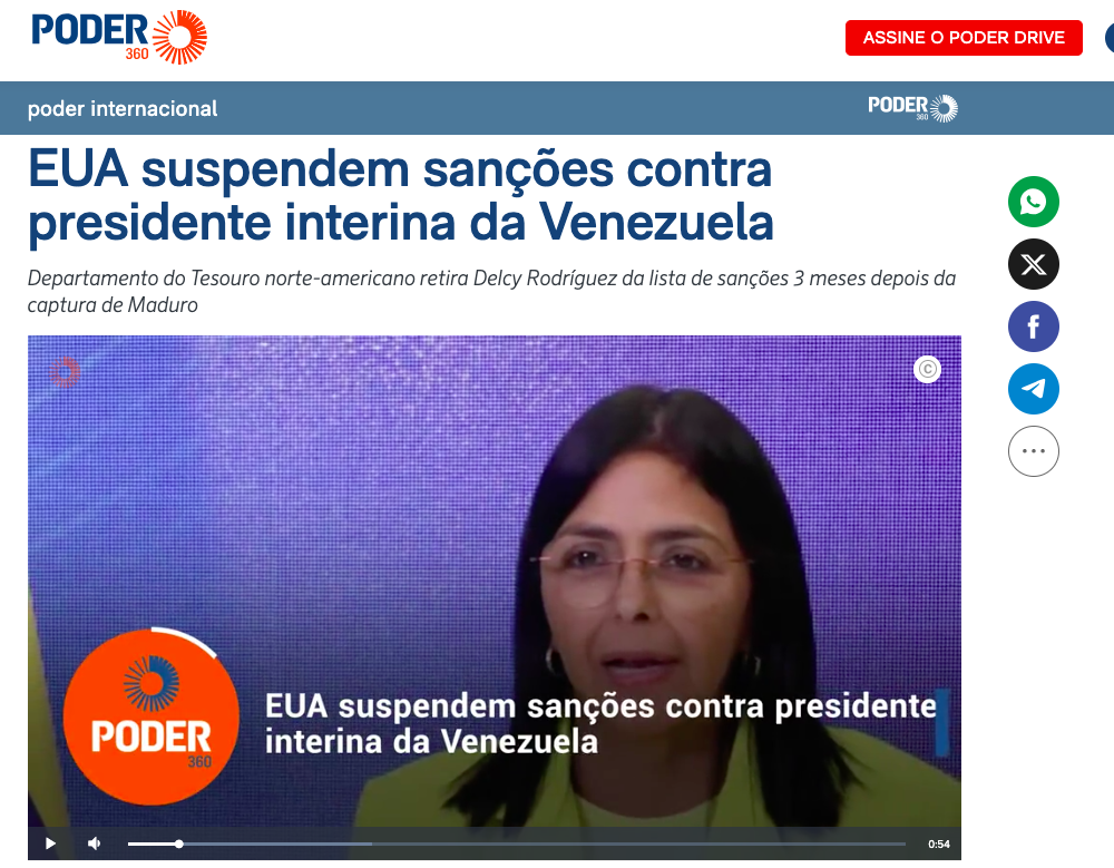 Os Estados Unidos suspenderam, nesta quarta-feira (1º de abril de 2026), as sanções impostas à presidente interina da Venezuela, Delcy Rodríguez. O Departamento do Tesouro norte-americano removeu oficialmente o nome dela da lista do Escritório de Controle de Ativos Estrangeiros (OFAC), encerrando as restrições que vigoravam desde 2018, de acordo com a matéria do PODER 360.