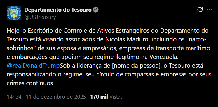 “Hoje, o Escritório de Controle de Ativos Estrangeiros do Departamento do Tesouro está visando associados de Nicolás Maduro, incluindo os “narco-sobrinhos” de sua esposa e empresários, empresas de transporte marítimo e embarcações que apoiam seu regime ilegítimo na Venezuela”, diz uma publicação divulgada nas redes sociais do departamento.