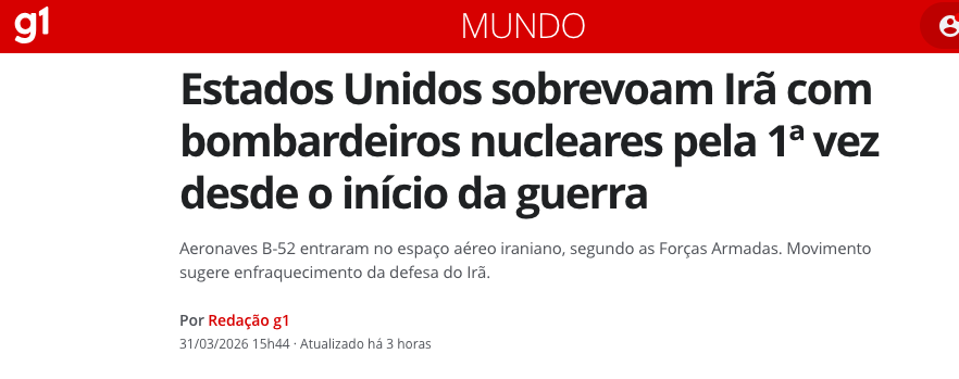 Os Estados Unidos anunciaram nesta terça-feira (31 de março de 2026) que realizaram, pela primeira vez desde o início do conflito com o Irã, um sobrevoo com bombardeiros B-52 no espaço aéreo iraniano. As aeronaves, que possuem capacidade nuclear, são consideradas a “espinha dorsal” da força de bombardeiros estratégicos americanos, de acordo com a matéria do G1.