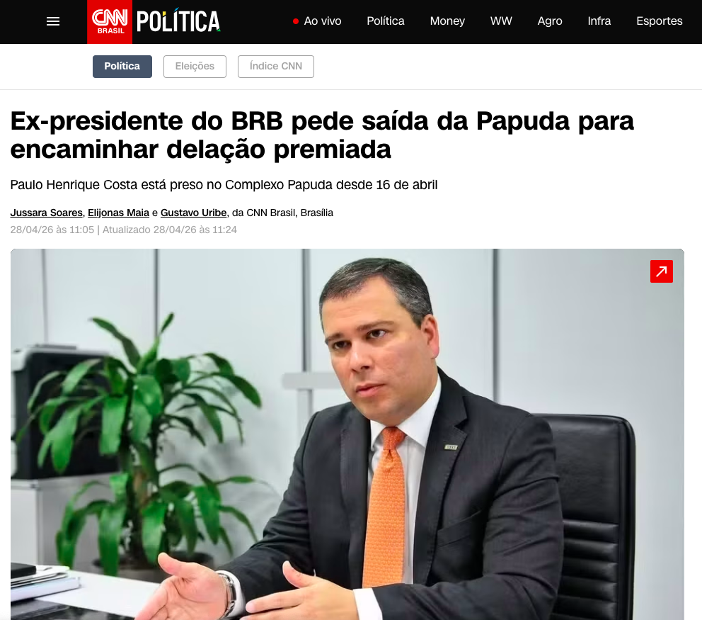 A defesa do ex-presidente do Banco de Brasília (BRB), Paulo Henrique Costa, protocolou pedido no Supremo Tribunal Federal (STF) para que ele seja transferido do Complexo Penitenciário da Papuda para a Superintendência da Polícia Federal. O objetivo é viabilizar o andamento de um acordo de delação premiada no âmbito das investigações sobre fraudes no Banco Master.