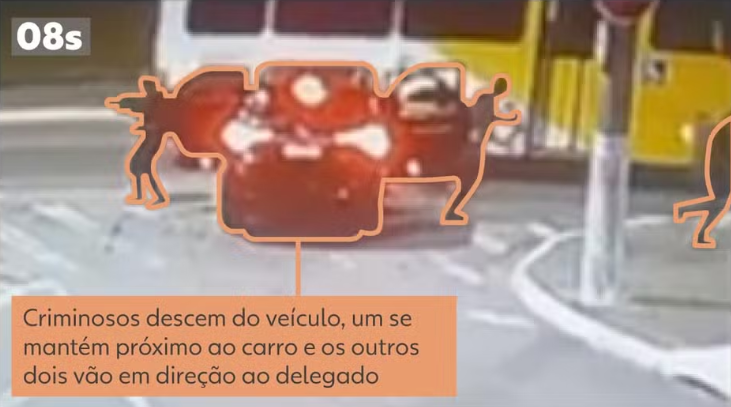 – Execução: Três atiradores, armados com fuzis, desceram da caminhonete que os transportava e efetuaram rajadas contra o ex-delegado, que morreu no local. O Serviço de Atendimento Móvel de Urgência (Samu) foi acionado e constatou o óbito imediatamente.