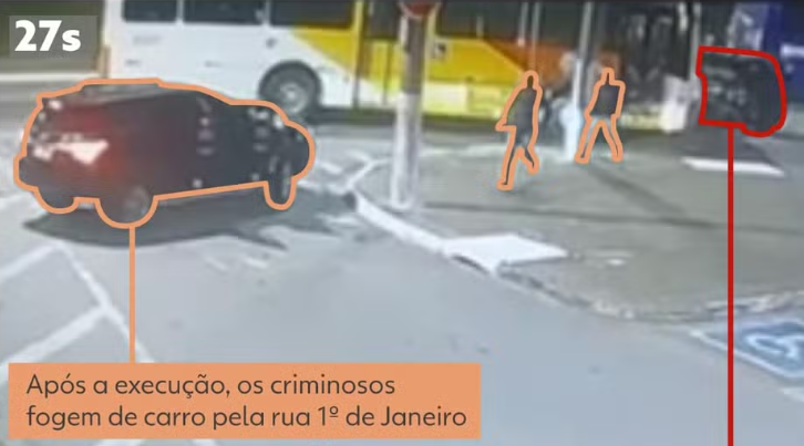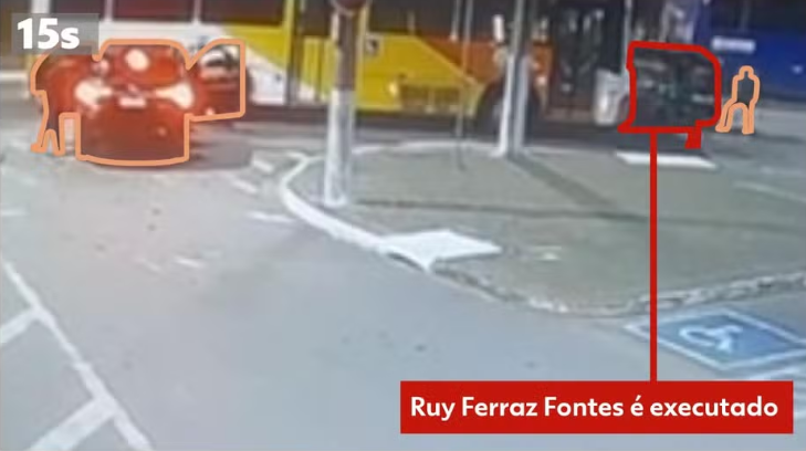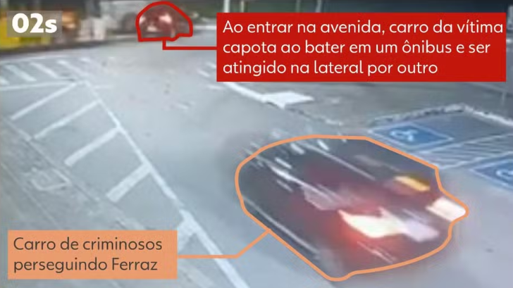 – Início da perseguição: Criminosos em uma caminhonete iniciaram o acompanhamento do carro de Fontes em vias paralelas à avenida principal. Vestígios de disparos foram encontrados na área, indicando que os tiros começaram antes da colisão final.