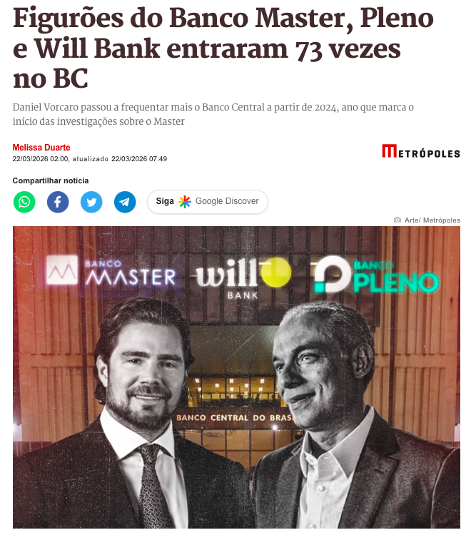Home / Polícia Federal / Executivos do Master, Pleno e Will Bank registraram 73 visitas ao BC